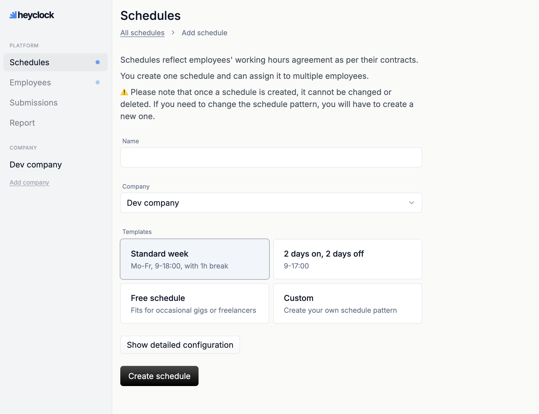 You can create multiple work schedules to fit various contractual agreements that you have with your employees. You can also just use predefined schedules we have prepared for you.