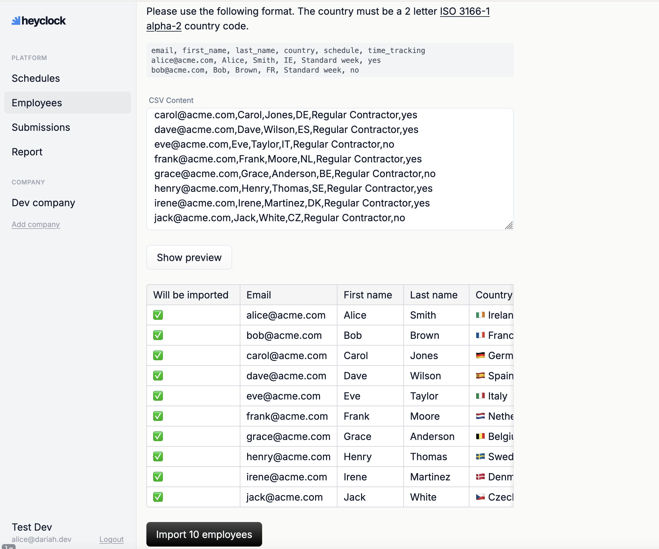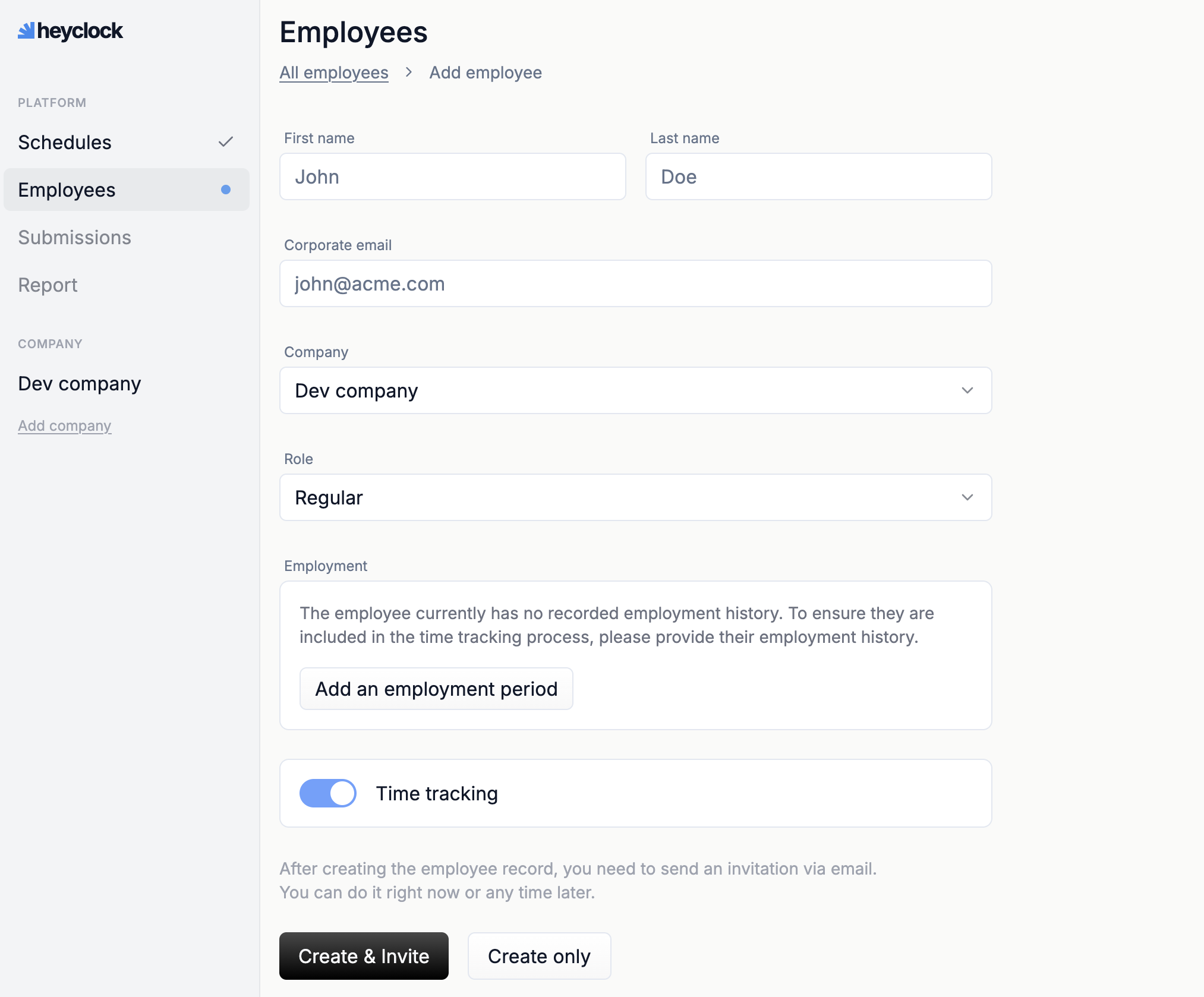 You can invite the employee to login to heyclock immediately, or simply create them and leave sending out invite for later. When an employee receives an invite they get access to their part of the system, where they can log their hours.