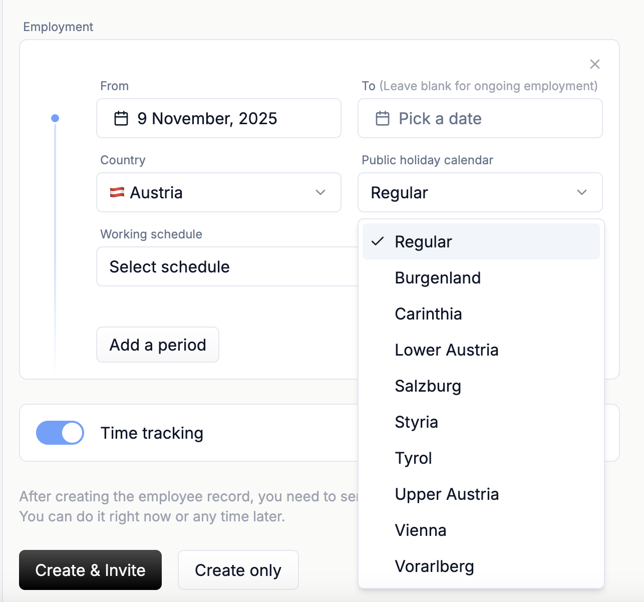 Define employment period, which is the start and end of your contractual agreement with them. Then, pick working schedule for this employee and set their holiday calendar.