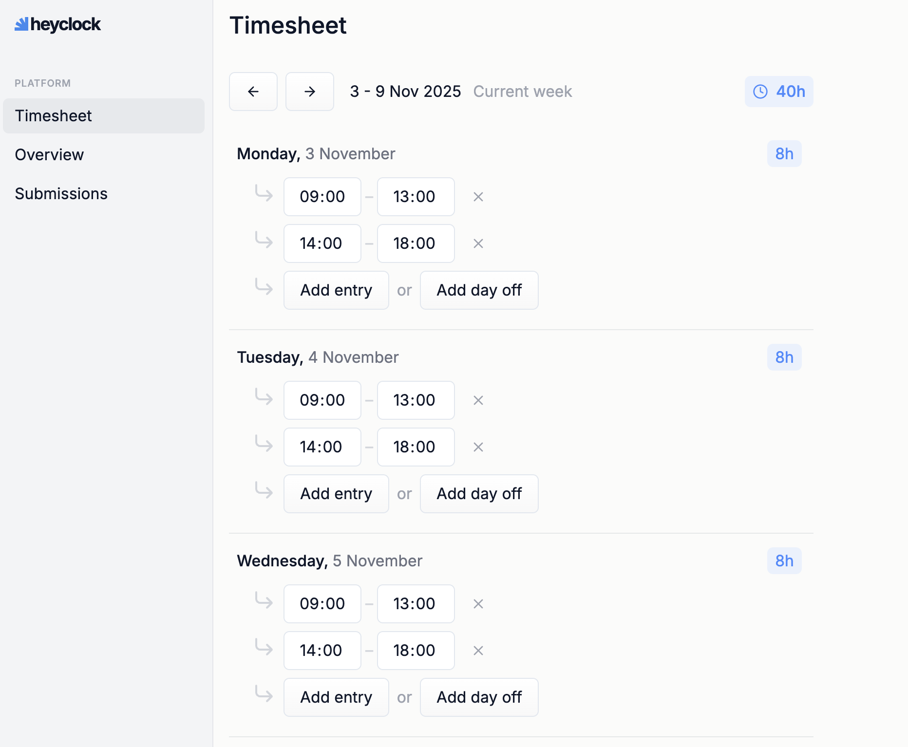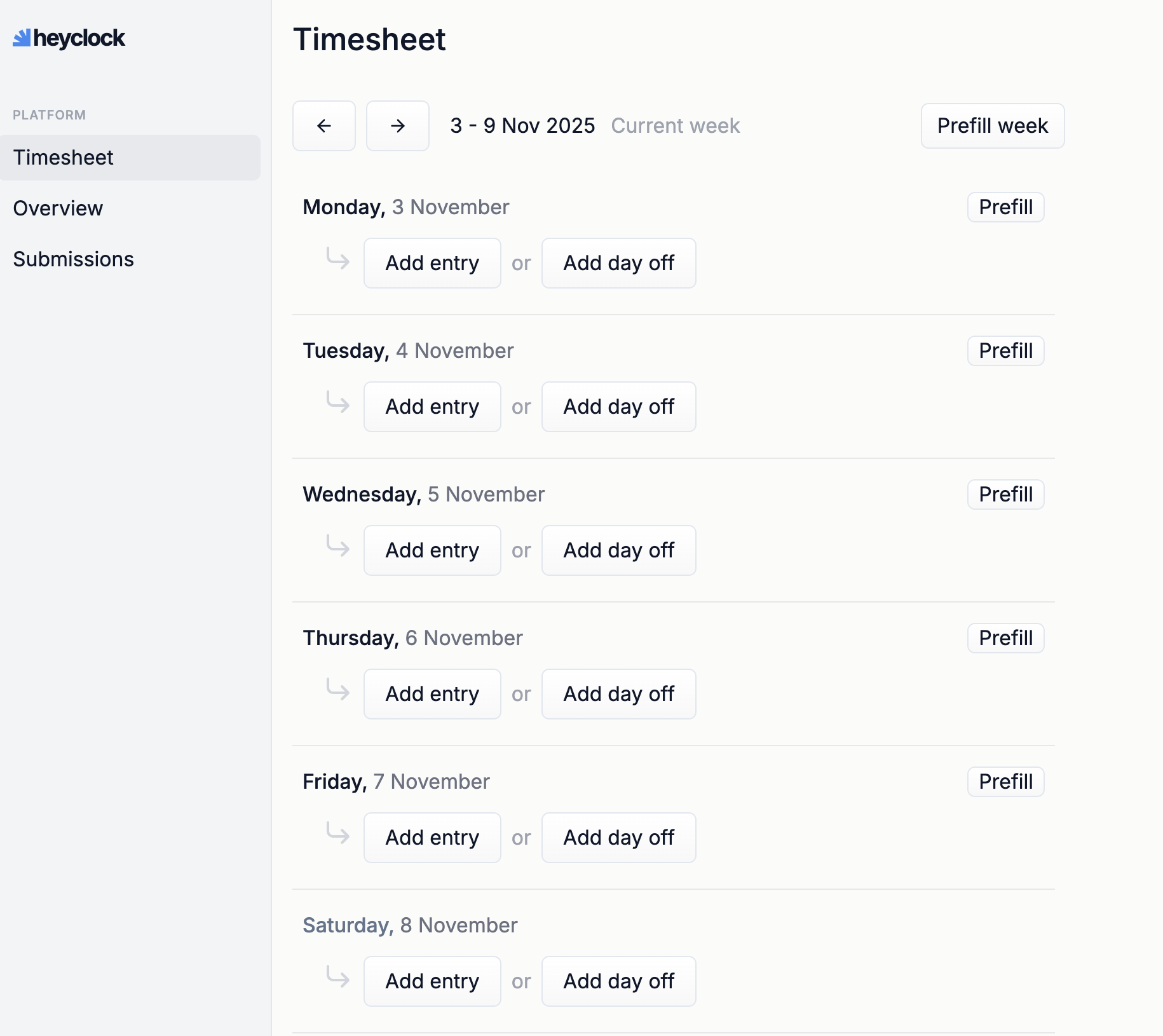 This is where you will enter your work hours. We are all aware how tedious this process can be, hence we created "Prefill week" button for you. You can use that to prefill the whole week in advance. The hours that your timesheet will be prefilled are the ones your employer defined for your working schedule as per your contract or agreement.