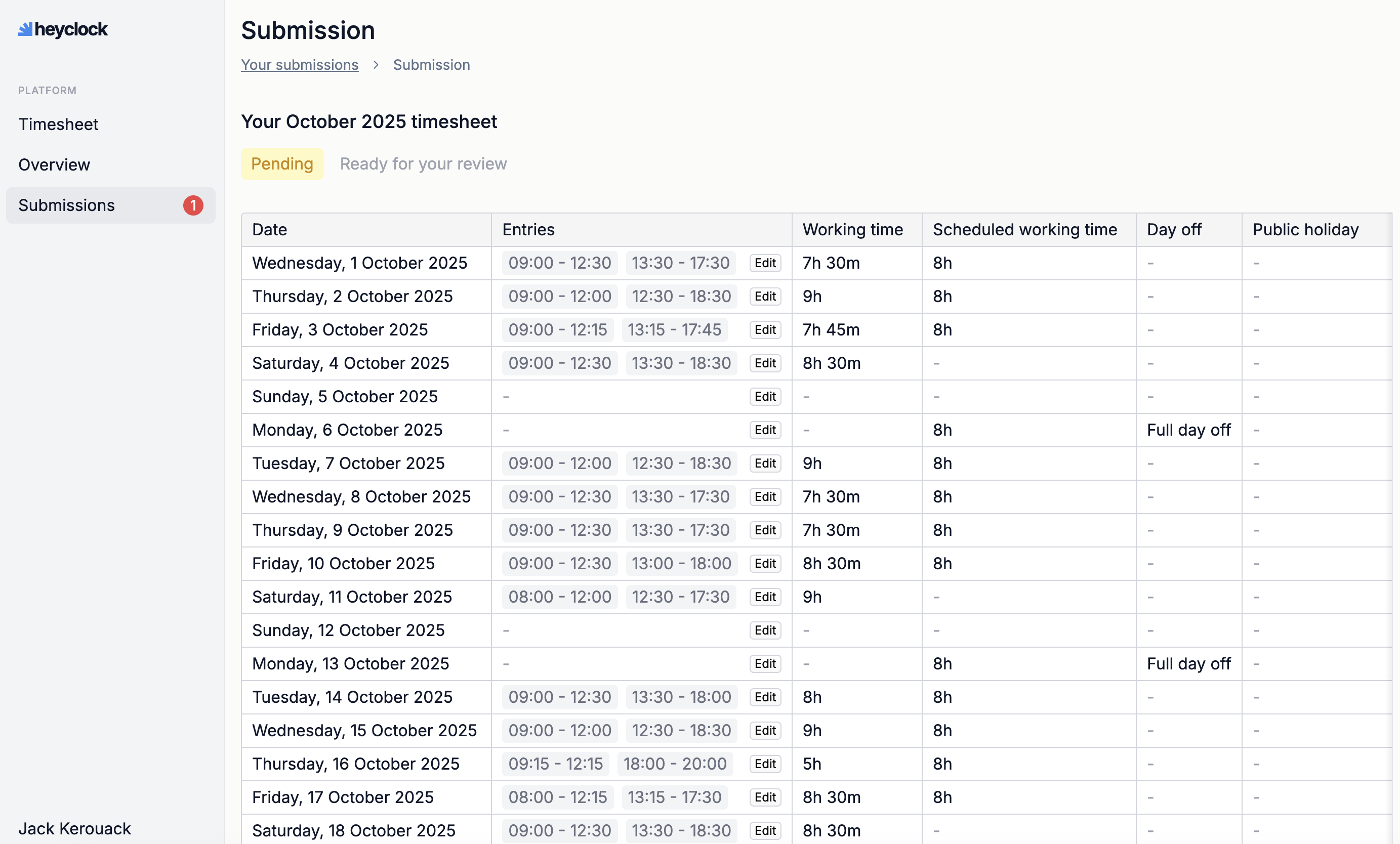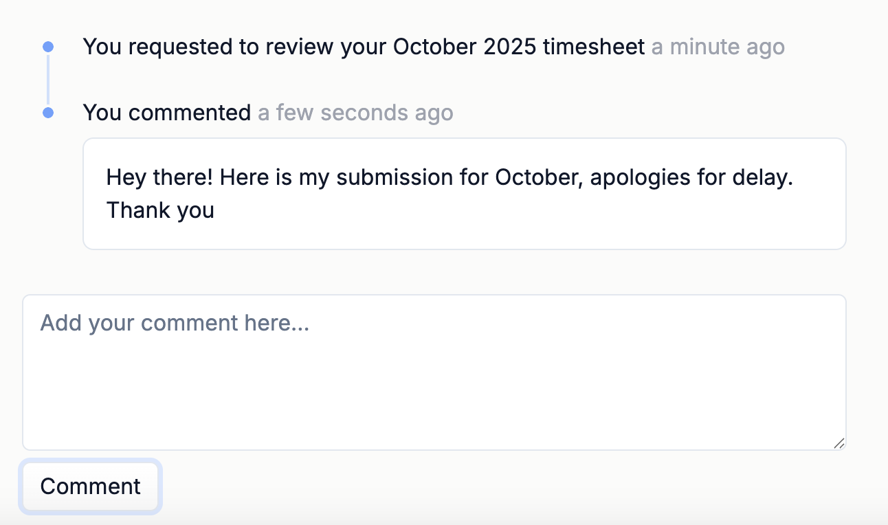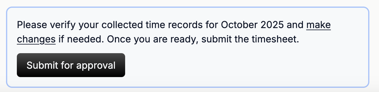 At the end of each month we automatically package all your hours in a submission, which you need to review before you send it off to your manager. Hours in the submission are editable, so no worries in case you forgot to record something.